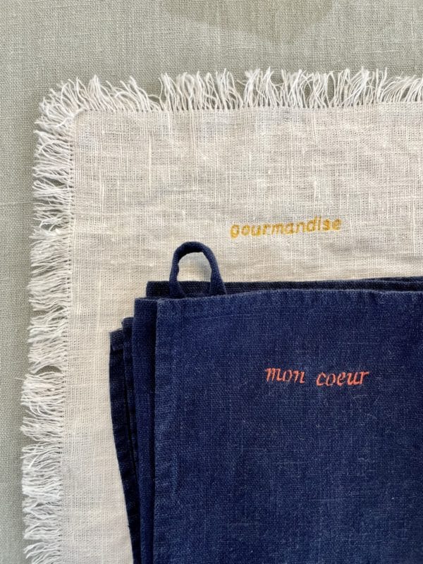 Pour étendre chez vous et vous approprier la douceur, l’authenticité et l’originalité de l’univers un chic fou, personnalisez votre lin de maison par des broderies délicates réalisées ici-même ! Des broderies colorées viendront rendre les lins un chic fou encore plus exceptionnels et uniques. Un mot, un nom propre, dans des couleurs de votre choix, viendra alors habiller votre intérieur…pour que un chic fou vous accompagne aussi chez vous !