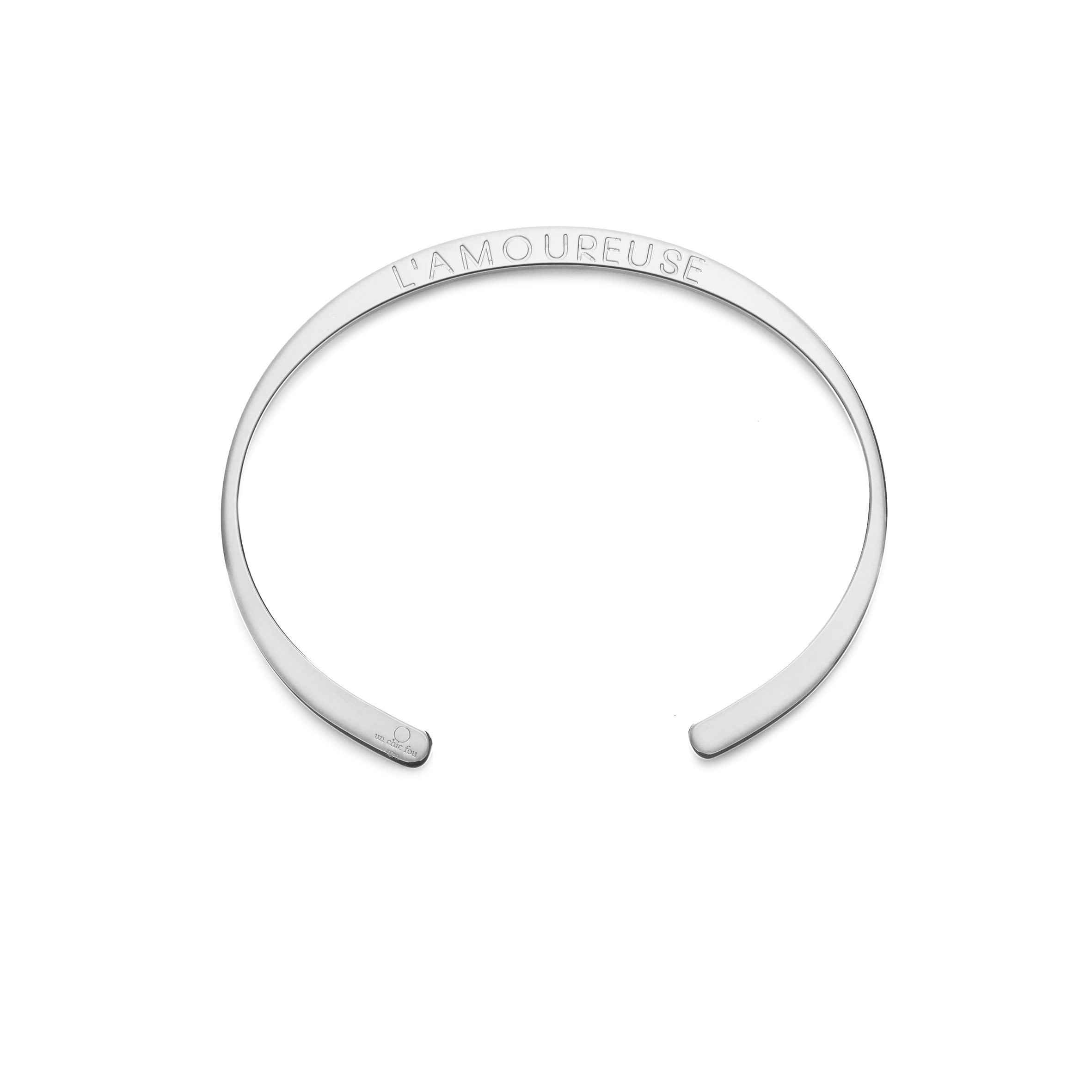 - Bracelet rigide, ajustable. Texte : “L’Amoureuse”.