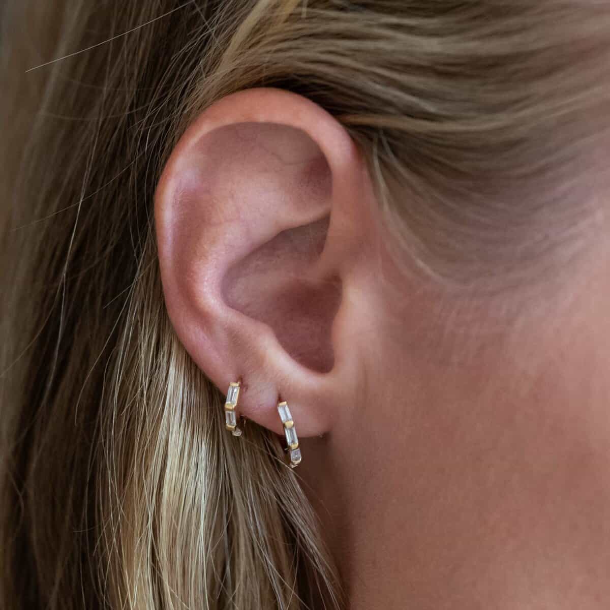 - Détails : diamètre extérieur 9mm, fermeture à encoche. Zircons blancs taille baguette.